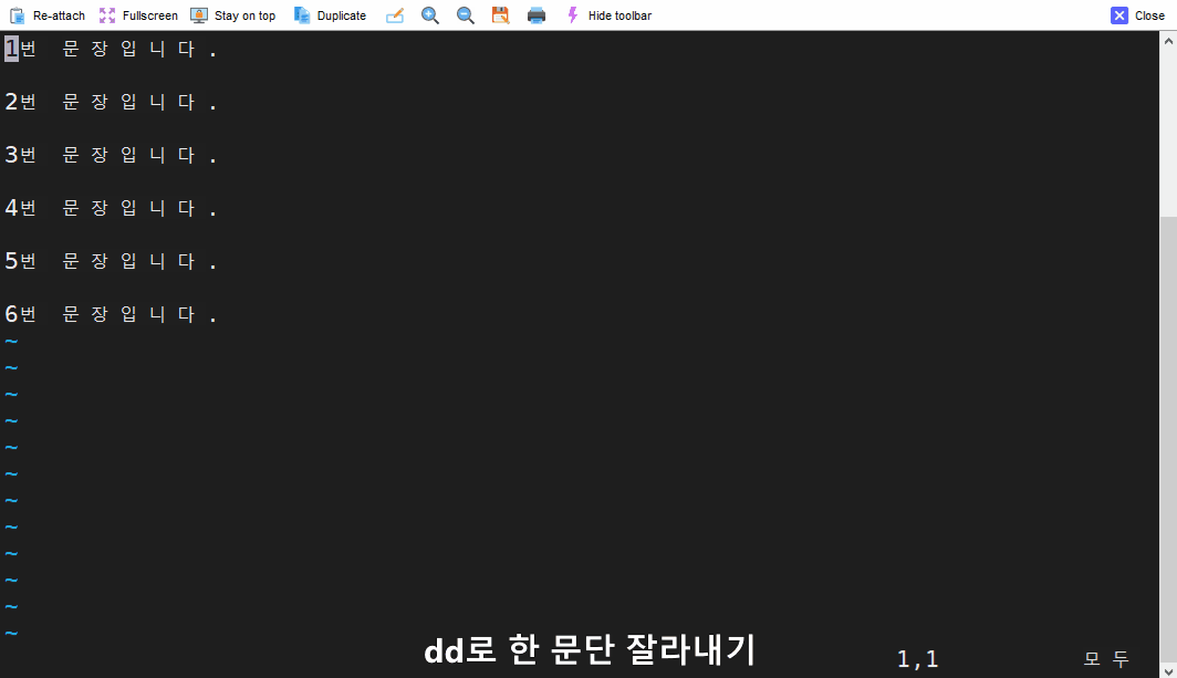 커서가 뒤에 있어도 그 행 전체가 명령에 포함된다.