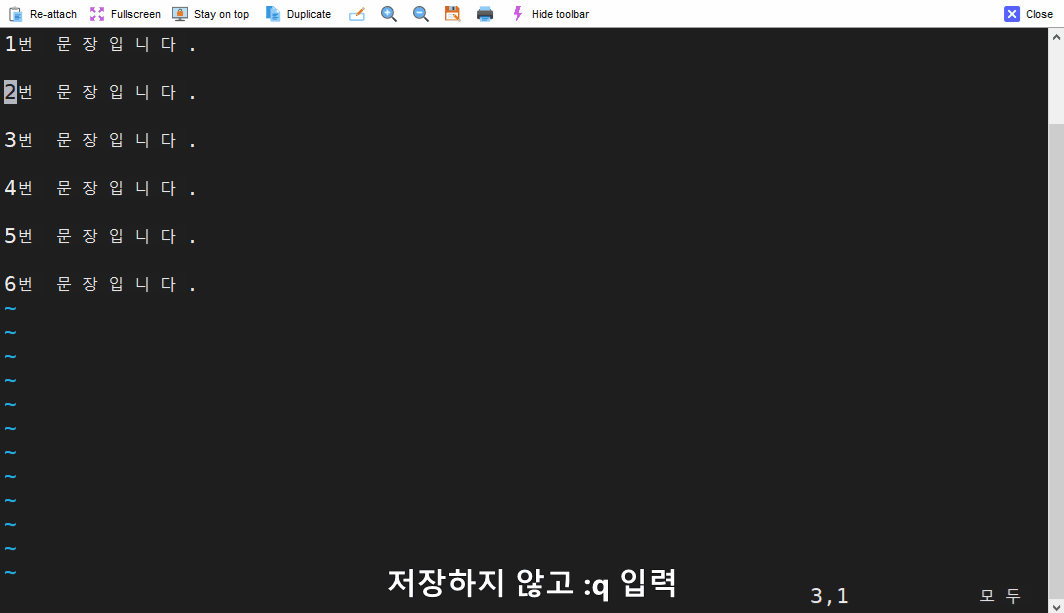 이때, :q! 를 입력하면 저장을 하지 않고 vi를 빠져나간다.