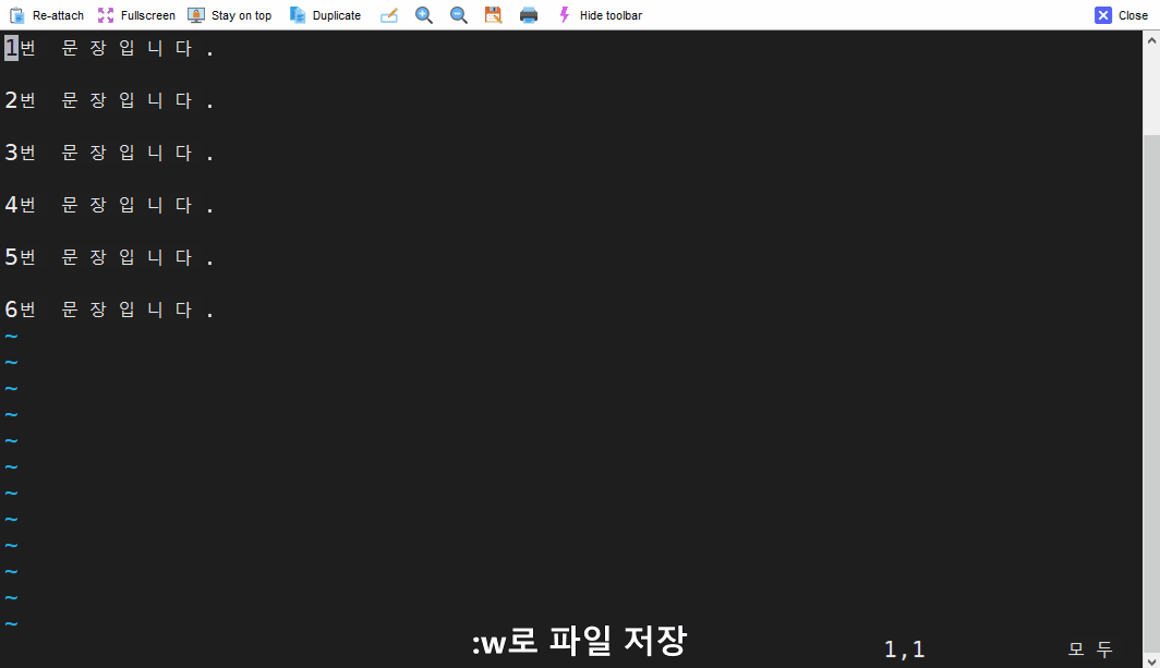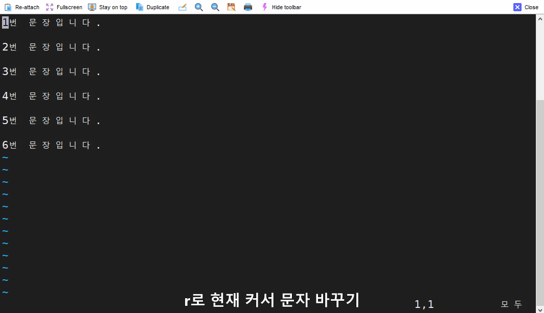 단 하나의 문자를 바꾸는데 입력모드로 변환하면 입력할 게 많다. 대신 r을 누르면 작업이 편해진다.