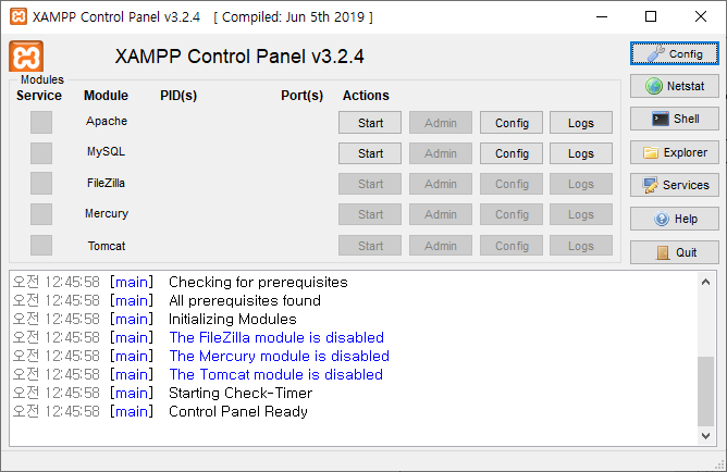 이로서 XAMPP 설치는 완료되었다. 이제 제대로 작동하는지 테스트를 할 차례다. Apache 옆의 Start 버튼을 눌러 웹서버를 구동시킨다.