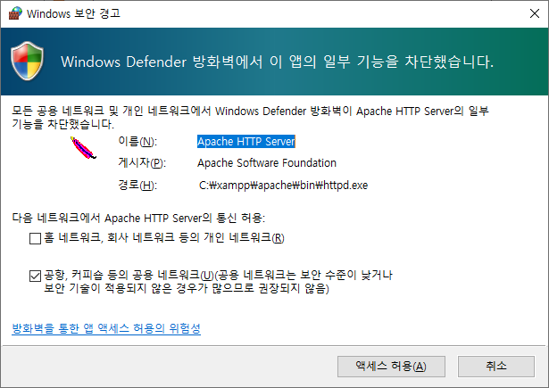 도중에 Apache 서버의 방화벽 경고가 뜨는데, 액세스 허용을 해 주도록 한다.