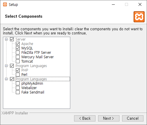 필요한 프로그램을 선택한다. 여기서는 기본인 Apache, MySQL, PHP만 선택하여 진행하였다. 필요에 따라 추가로 선택을 한 후 진행을 하면 된다.