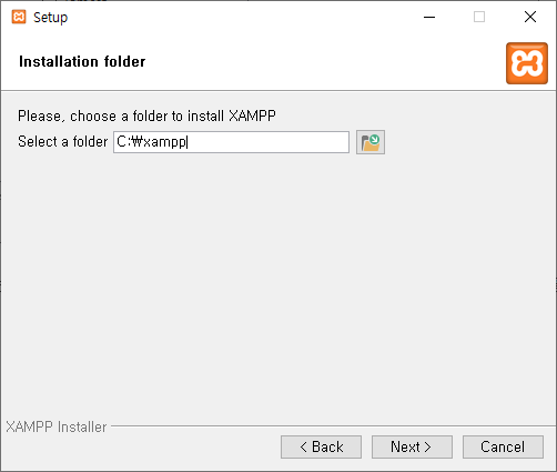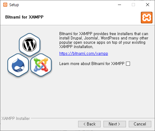 XAMPP에 대해 더 알아볼 필요는 없으므로 살며시 체크박스를 해제하고 다음으로 진행한다.