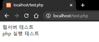 test.php라는 파일명으로 htdocs폴더에 저장한 후 브라우저에서 localhost/test.php를 입력한다.