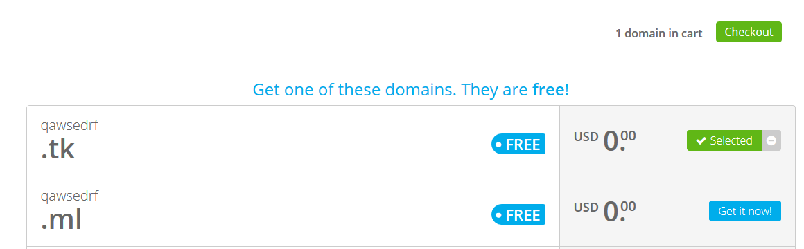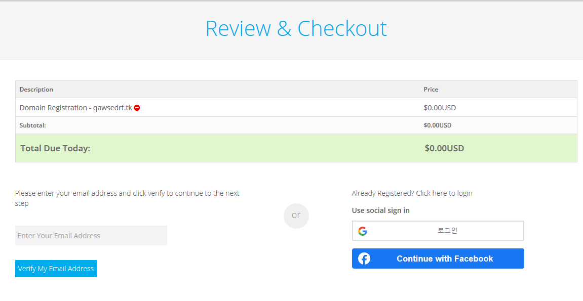 마음에 드는 도메인을 선택하였으면 Checkout버튼을 눌러 다음으로 진행한다.