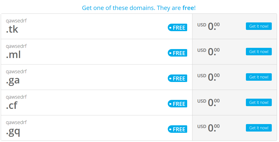이 사이트는 무료 도메인을 제공하는데 일반적인 도메인이 아닌 .cf나 .ga 같은 잘 사용하지 않는 도메인을 제공한다.