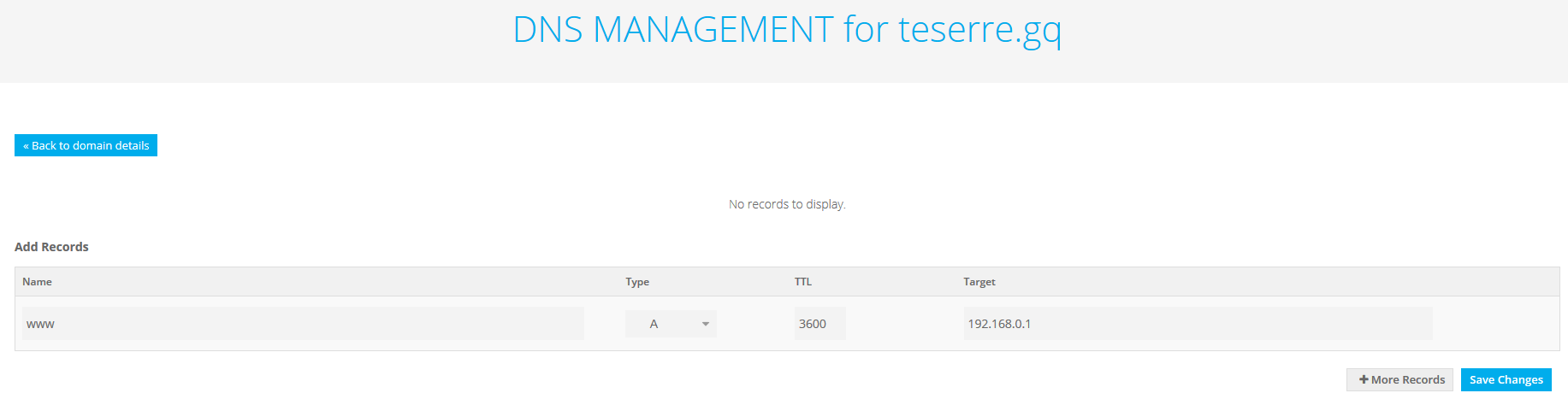 Manage Freenom DNS를 클릭하면 도메인에 관한 설정을 수정할 수 있는 화면이 나온다. Name은 사용할 주소 앞에 붙는 이름이다. 만약 Name에 아무것도 붙이지 않으면 teserre.gq 만으로도 서버에 접근이 가능하다. www를 붙이면 www.teserre.gq를 입력해야 서버에 접근이 가능해 진다.