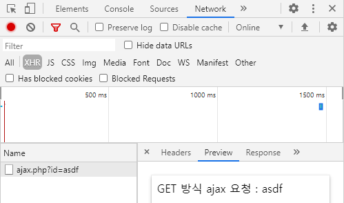 개발자 도구에서 확인을 해 보면 정상적으로 작동이 되는 것을 확인할 수 있다. 네트워크 항목에서 XHR을 누르면 ajax.php에 요청이 된 것이 보인다.