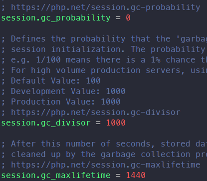 예시 이미지에는 gc_probability가 0으로 설정되어 있지만, 주석을 보면 일반적으로 1로 설정이 되는 듯하다. 즉, 세션이 시작될 때 1/1000의 확률로 gc가 실행이 되고, 모든 세션을 조회하여 마지막 요청으로부터gc_maxlifetime에 설정된 시간이 지난 세션이 있다면 삭제를 한다.
